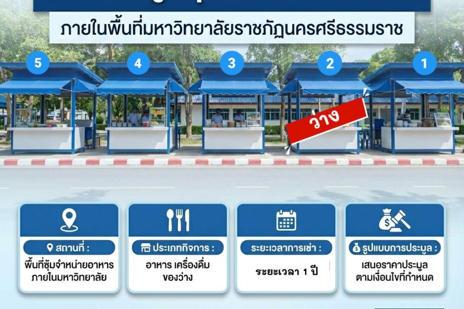 มหาวิทยาลัยราชภัฏนครศรีธรรมราช ขอเชิญผู้สนใจ ยื่นซองเสนอราคาเช่าพื้นที่เพื่อจำหน่ายอาหารและเครื่องดื่ม ภายในศูนย์อาหาร (Food Park) มหาวิทยาลัยราชภัฏนครศรีธรรมราช ครั้งที่ 7/2568ลักษณะพื้นที่ :...