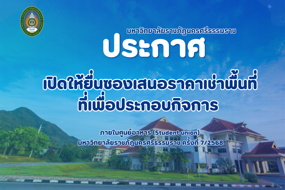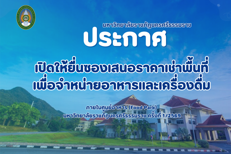 มหาวิทยาลัยราชภัฏนครศรีธรรมราช ขอเชิญผู้ที่มีความประสงค์ ยื่นซองเสนอราคาเช่าพื้นที่เพื่อประกอบกิจการ ภายในศูนย์อาหาร (Student Union) มหาวิทยาลัยราชภัฏนครศรีธรรมราช ครั้งที่ 1/2569 ลักษณะพื้นที่ พื้นที่เพื่อจำหน่ายอาหาร...
