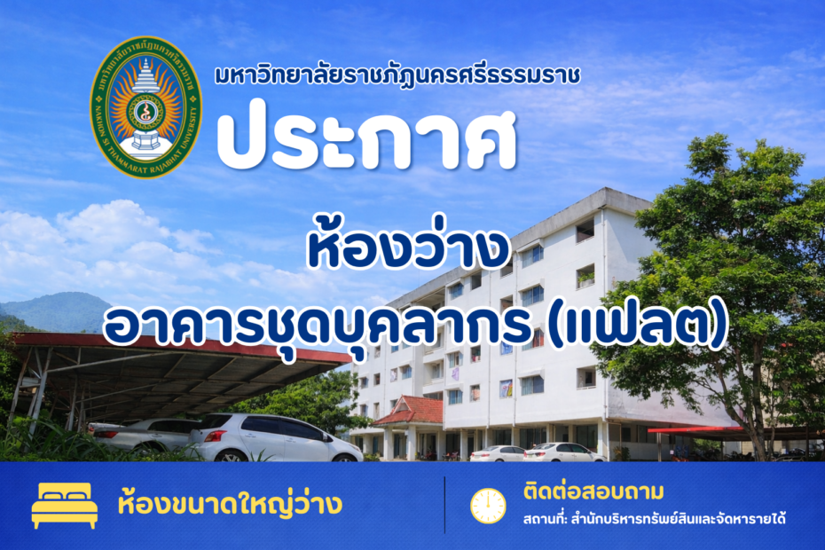 ประกาศห้องว่าง อาคารชุดบุคลากร(แฟลต) อาคารชุดบุคลากร(แฟลต) มีห้องขนาดใหญ่ว่าง เหมาะสำหรับบุคลากรที่ต้องการที่พักภายในมหาวิทยาลัย สนใจติดต่อสอบถามรายละเอียดได้ที่ สำนักบริหารทรัพย์สินและจัดหารายได้ ในวันและเวลาราชการ ห้องมีจำนวนจำกัด ผู้สนใจสอบถามได้เลย