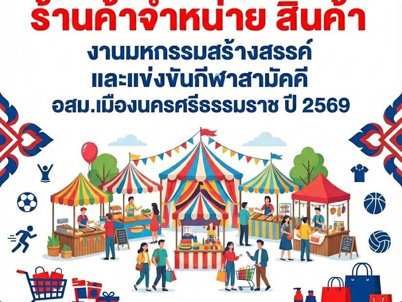 ประกาศรับสมัครร้านค้าจำหน่ายสินค้า งานมหกรรมสร้างสรรค์ และแข่งขันกีฬาสามัคคี อสม.เมืองนครศรีธรรมราช ปี 2569วันศุกร์ ที่ 20 มีนาคม 2569ขอเชิญผู้ประกอบการ...