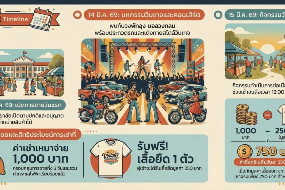 มหาวิทยาลัยราชภัฏนครศรีธรรมราช ขอเชิญชวนประชาชน นักท่องเที่ยว และผู้ที่หลงใหลในเสน่ห์ของรถคลาสสิก ร่วมสัมผัสบรรยากาศงานเทศกาลวินเทจสุดยิ่งใหญ่ ระหว่างวันที่ 13 – 15 มีนาคม 2569 ณ มหาวิทยาลัยราชภัฏนครศรีธรรมราช ภายในงานพบกับกิจกรรมมากมาย อาทิ การรวมตัวของรถคลาสสิกและรถวินเทจ การแสดงดนตรีและคอนเสิร์ตจากศิลปินชื่อดัง การประกวดแต่งกายสไตล์วินเทจ โซนร้านค้า อาหาร และสินค้าหลากหลาย สำหรับผู้ประกอบการที่สนใจออกร้านจำหน่ายสินค้า...