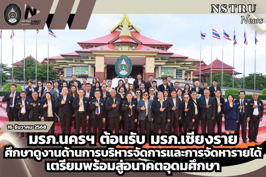 วันที่ 16 ธันวาคม 2568ดร.สมปอง รักษาธรรม รักษาราชการแทนอธิการบดีมหาวิทยาลัยราชภัฏนครศรีธรรมราช ให้การต้อนรับคณะผู้บริหารและคณะกรรมการจากมหาวิทยาลัยราชภัฏเชียงราย ในโอกาสเดินทางมาศึกษาดูงานด้านการบริหารจัดการและการจัดหารายได้สำหรับสถาบันอุดมศึกษาในปัจจุบันและอนาคต ณ ห้องประชุมท่อแก้ว สำนักงานอธิการบดี มหาวิทยาลัยราชภัฏนครศรีธรรมราชการศึกษาดูงานครั้งนี้จัดขึ้นเพื่อส่งเสริมและพัฒนาศักยภาพของกรรมการสภามหาวิทยาลัย กรรมการสภาวิชาการ และกรรมการพิจารณาทางวิชาการของมหาวิทยาลัยราชภัฏเชียงราย ให้มีความรู้ ความเข้าใจ และวิสัยทัศน์ด้านการบริหารจัดการสถาบันอุดมศึกษา รวมถึงเป็นเวทีแลกเปลี่ยนเรียนรู้แนวคิด นโยบาย และแนวปฏิบัติที่เหมาะสมในการบริหารจัดการและการสร้างรายได้ของมหาวิทยาลัย ให้สอดคล้องกับบริบทการเปลี่ยนแปลงของสังคม เศรษฐกิจ และพลวัตของอุดมศึกษาในอนาคตโอกาสนี้ได้รับเกียรติจาก รองศาสตราจารย์ ดร.วิชัย แหวนเพชร นายกสภามหาวิทยาลัยราชภัฏนครศรีธรรมราช บรรยายพิเศษในหัวข้อนโยบายและทิศทางการบริหารมหาวิทยาลัยในปัจจุบันและอนาคต และ ยุทธศาสตร์และแนวทางการบริหารงานวิชาการและการจัดหารายได้ของมหาวิทยาลัยในปัจจุบันและอนาคต… มรภ.นครฯ ต้อนรับ มรภ.เชียงราย ศึกษาดูงานด้านการบริหารจัดการและการจัดหารายได้